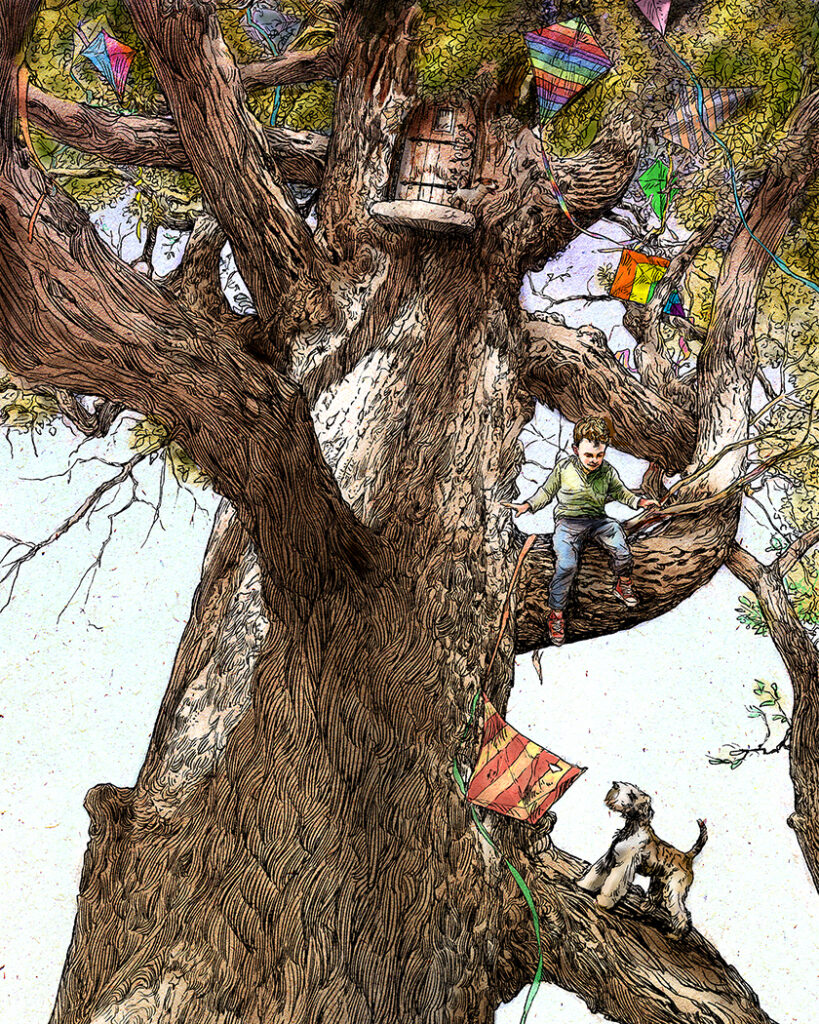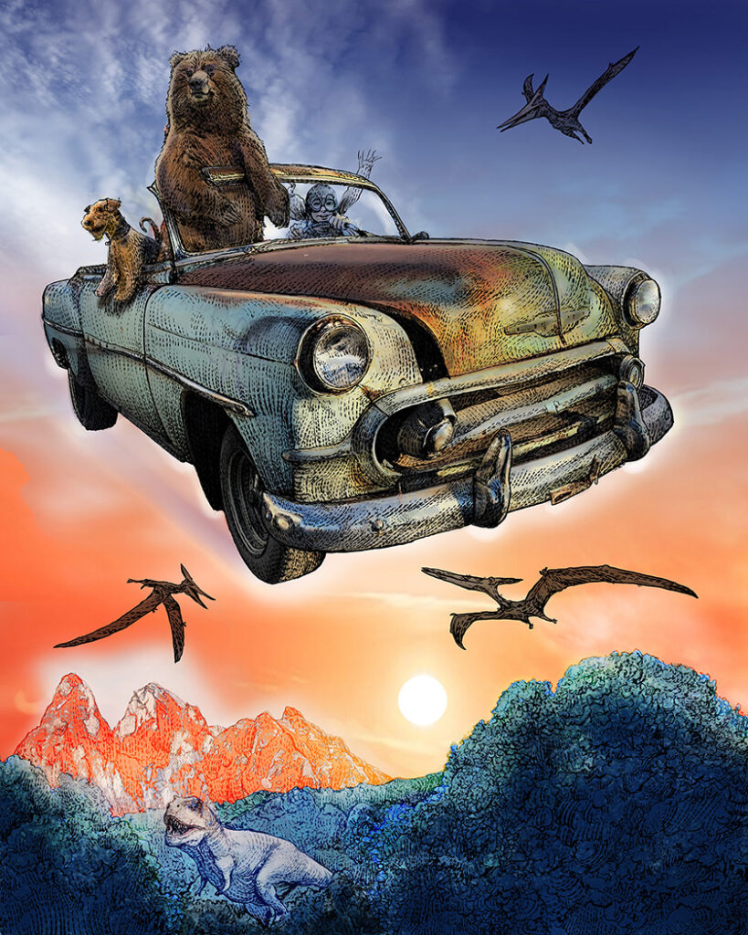 Children’s Book Illustration:  Based on my father’s relationship with my son.  A tribute to my father’s approach to life – the feeling that our greatest adventures begin with the friends we meet along the way.